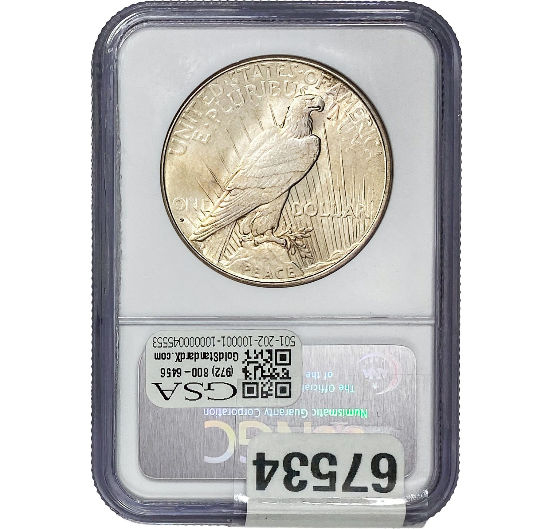 l. All non-certified coins and currency are guaranteed genuine, but are not guaranteed as to grade, since grading is a matter of opinion, an art and not a science, and therefore the description rendered by GSA or any third-party grading service may not agree with the opinion of others (including trained experts), and the same expert may not grade the same item with the same grade at two different times. GSA may, but is not obligated to, express an opinion as to non-certified numismatic items, in GSA’s opinion, or by its employees’ experience and the current interpretation of the American Numismatic Association’s standards as of the date the catalog was prepared. There is no guarantee or warranty expressed or implied that the grading opinions utilized by GSA, if any, will meet the standards of any grading service at any time in the future.