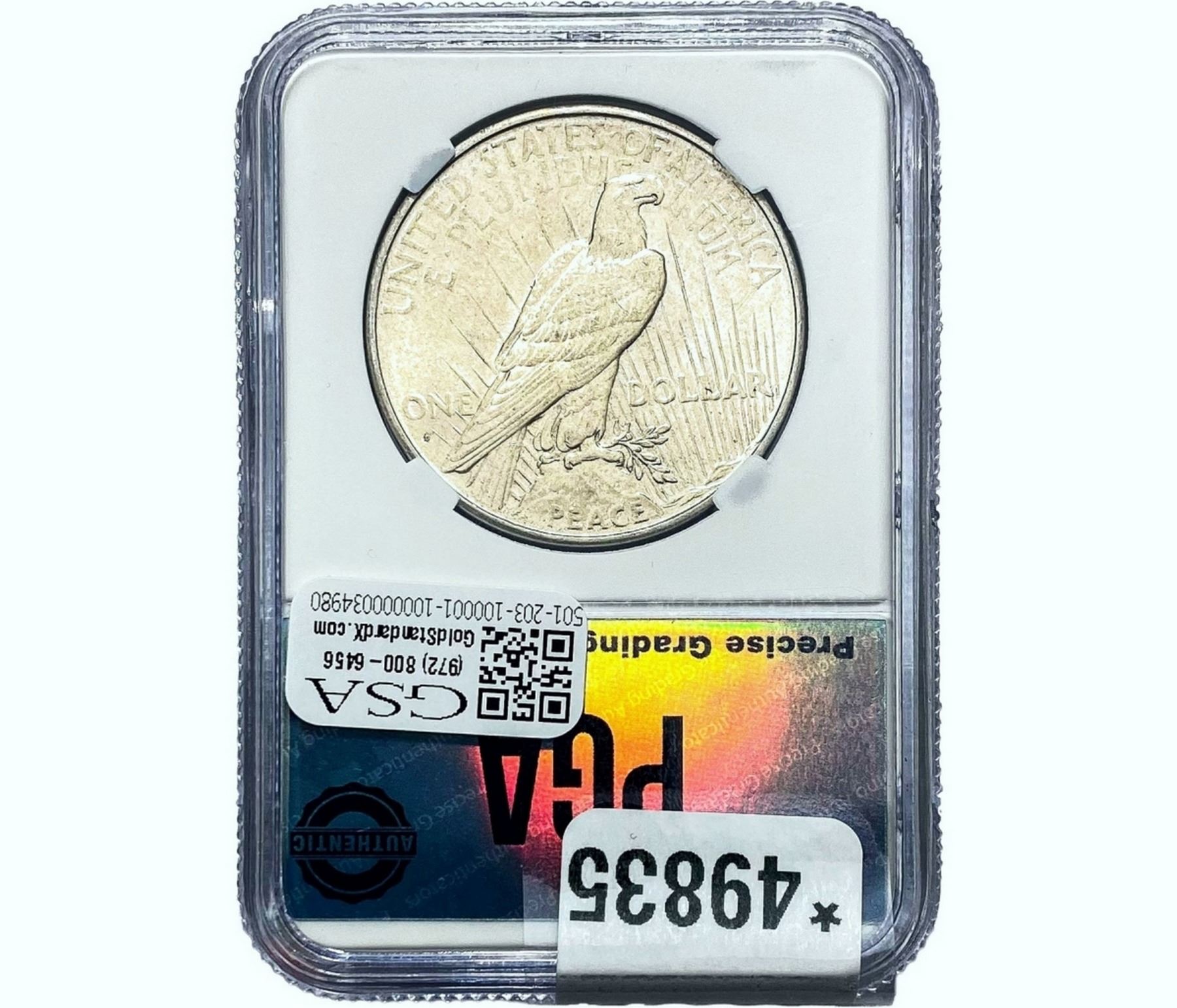 l. All non-certified coins and currency are guaranteed genuine, but are not guaranteed as to grade, since grading is a matter of opinion, an art and not a science, and therefore the description rendered by GSA or any third-party grading service may not agree with the opinion of others (including trained experts), and the same expert may not grade the same item with the same grade at two different times. GSA may, but is not obligated to, express an opinion as to non-certified numismatic items, in GSA’s opinion, or by its employees’ experience and the current interpretation of the American Numismatic Association’s standards as of the date the catalog was prepared. There is no guarantee or warranty expressed or implied that the grading opinions utilized by GSA, if any, will meet the standards of any grading service at any time in the future.