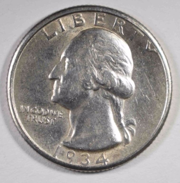 1934-D WASHINGTON QUARTER, CH AU ESTIMATE $110 - $120.