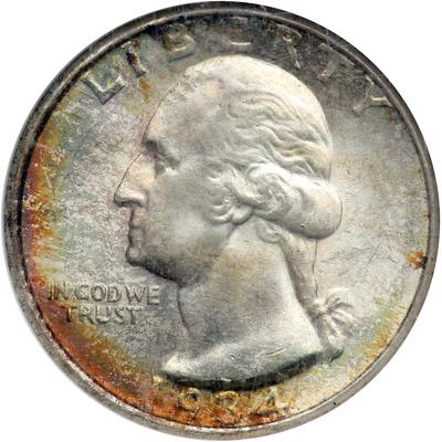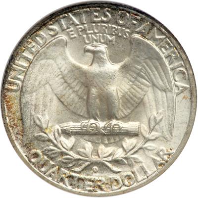 1934-D Washington Quarter Dollar. NGC graded MS-66. A crescent of lovely amber shade toning on the obverse. Pop 36; 4 finer in 67.
