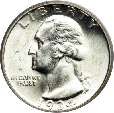 1934-D Washington Quarter Dollar. PCGS graded MS-64. Predominantly untoned, the surface cascades with the gleam of white luster (PCGS # 5796) .