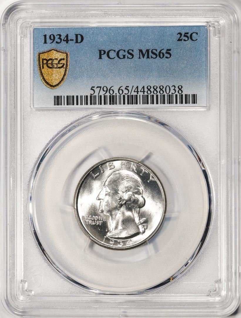 One 1934-D Washington Quarter Coin PCGS MS65. PCGS Graded.