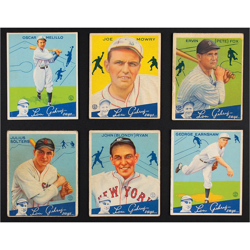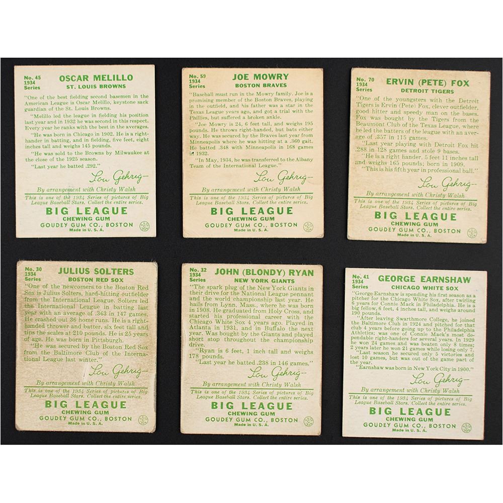 Ungraded lot of six 1934 Goudey baseball cards, grading VG-EX overall. Includes: #30 Julius Solters (G), #32 John 'Blondy' Ryan (VG), #41 George Earnshaw (EX), #45 Oscar Melillo (EX), #52 Joe Mowry (VG-EX), and #70 Pete Fox (VG).