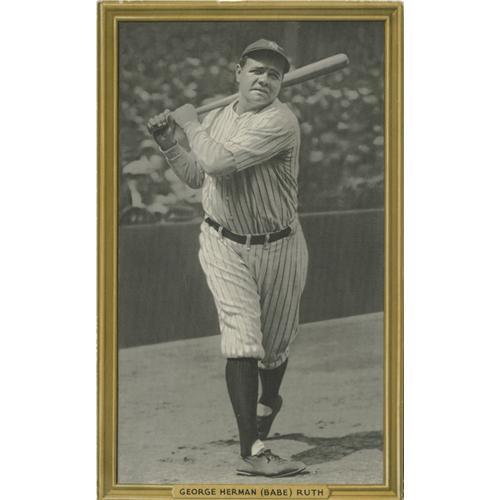 <B>1934 Goudey Premiums (R309-1) Babe Ruth.</B></I> Rarely seen easel-backed "card" presents an image of Ruthian proportions, measuring a full 5.5x8.75" in size. Mild wear at the edges and corners, and the lightest of bends at bottom left suggest a technical VG-EX rating, though the piece presents far better than this. Even many of the advanced Ruth card collectors are lacking this one in their personal holdings. <BR><BR><B>Important notice:</B> Heritage usually auctions material at the rate of 200-250 lots per hour. On some occasions eBay Live bid software or the Internet may not be able to keep up with the pace of the auction. We recommend placing a realistic absentee bid now as insurance to avoid disappointment. Occasionally the auctioneer may eliminate or reject an eBay Live bid, and the auctioneer may also reopen a lot after the close of the eBay live bidding (usually because we missed an audience bid), and may reject your bid even if it shows you as the winning bidder. By bidding via eBay Live, you agree that Heritage may award the lot to another bidder at its sole discretion under the circumstances described above or any other reasonable circumstances. Since eBay bids are not shown to us until we open the lot on the floor, we treat those bids just like floor bids. In most cases the floor responds before the eBay bid is presented to us, due to Internet lag time, so for consistency we have made it a policy that floor bids are always considered first over tie eBay live bids. Also please note that all Heritage lots purchased through eBay Live carry a 22.5% Buyer's Premium. Please make sure you read the Terms and Conditions before you bid. This lot is being auctioned in conjunction with a live floor auction by Heritage Galleries & Auctioneers. All final auction and invoice information will be supplied by Heritage Galleries & Auctioneers, and all other information should be considered preliminary. Lot:19548 <BR><BR><B>Winning Notification and Billing:</B> After the FINAL session in this auction is complete, Heritage will send e-mail and snail mail invoices. This process normally takes several days. All final auction and invoice information will be supplied by Heritage Galleries & Auctioneers, and all other information should be considered preliminary. <BR><BR>This auction will be conducted on a live auction floor and over the Internet through eBay Live. If you choose to place an absentee bid, please take a moment to <font color='#0000ff'><u><a href='http://pages.ebay.com/liveauctions/help/before/laabsentee.html'>learn how eBay Live absentee bidding works</a></u></font><font color='#000000'>