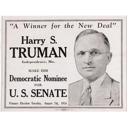 <B>1934 Harry Truman Senate Poster.</B></I> 13" x 10", framed and matted under glass to an overall size of 19.5" x 16.5", printed by Inter-City News Print, 1934. A beautiful item from Truman's successful Democratic Senate campaign that features a portrait of a bespectacled Truman with the slogan "A Winner for the New Deal." Items from Truman's first Senatorial campaign are rare and seldom are offered for sale especially in this near perfect condition. The poster is enhanced by its attractive presentation in a modern wooden frame. This is the first example of this significant Truman poster which we have handled.<BR><BR><b>Shipping:</b> Framed (<a target="_blank" href="http://www.heritageauctions.com/common/shipping.php">view shipping information</a>)