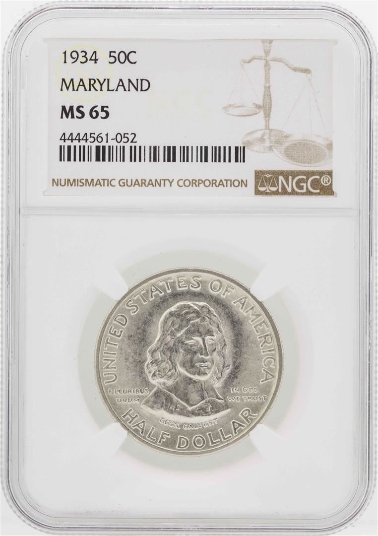 One 1934 Maryland Tercentenary Commemorative Half Dollar Coin NGC MS65. NGC Certified.