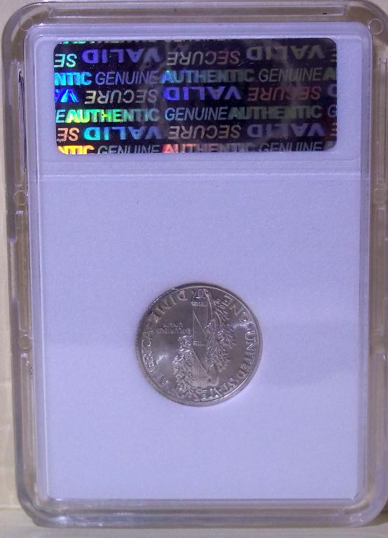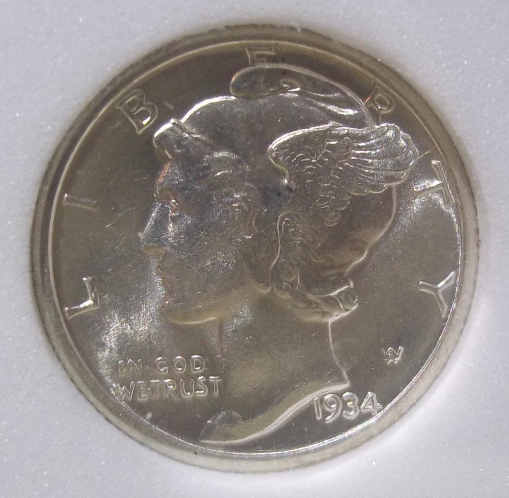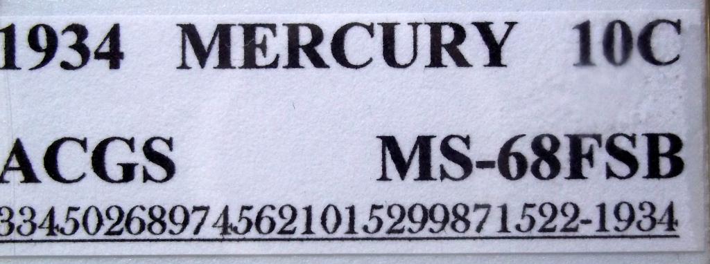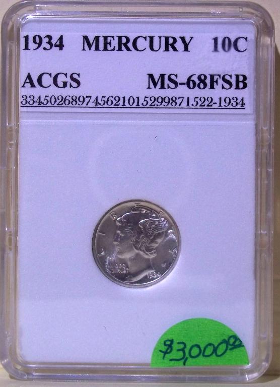 1934 Philadelphia Mint Mercury Dime, certified and graded Mint State 68 Full Split Bands by ACGS! Only the first strike coins have the coveted Full Split Bands reverse, and they sell for many times the price of more common strikes. The Dimes featured today are all from the estate of a fanatic collector who ONLY accepted the very highest grade coins available. The widow has NO INTEREST WHAT SO EVER in coin collecting, and she wants them GONE
