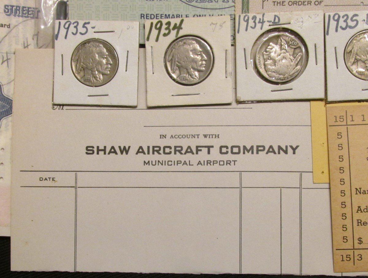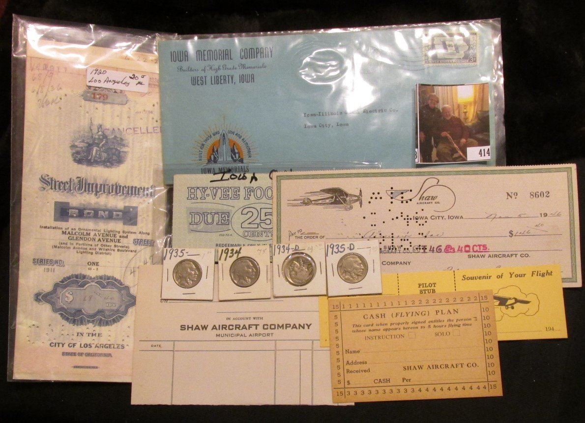 1934 P, D, 35P, & D Buffalo Nickels, grading Good to Fine; Iowa Statehood Stamped Cover from "Iowa Memorial Company…West Liberty, Iowa"; 25cents Hy-Vee Food Stamp Due Bill, from Iowa City Hy-Vee store; 1920 City of Los Angeles, Ca. Street Improvement Bond; & several pieces of memorabilia from "Shaw Aircraft Co." in Iowa City.