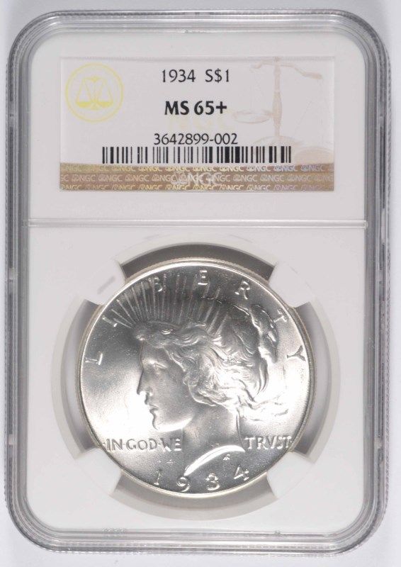 1934 PEACE SILVER DOLLAR, NGC MS-65+ BLAST WHITE, LOOKS MS-66 FOR SURE VERY RARE
