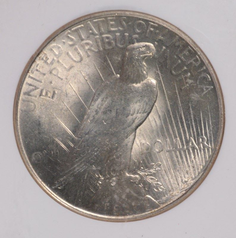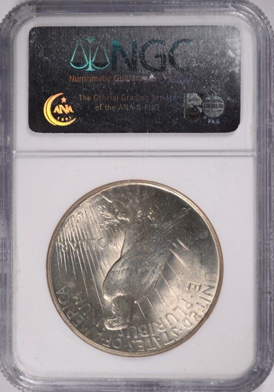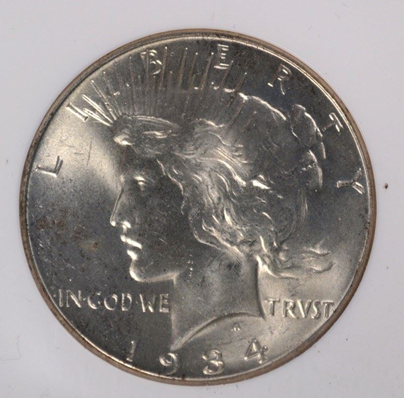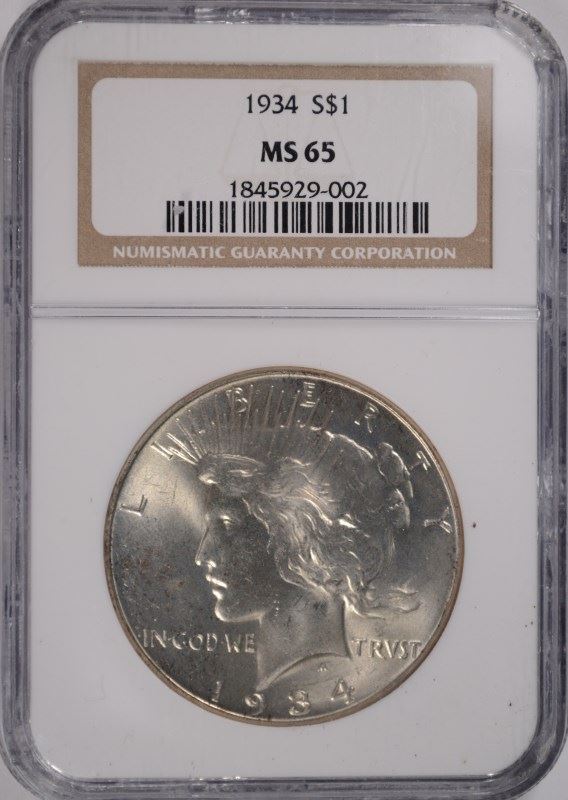 1934 PEACE SILVER DOLLAR, NGC MS-65 UPPER RIGHT CORNER CRACKED ON HOLDER