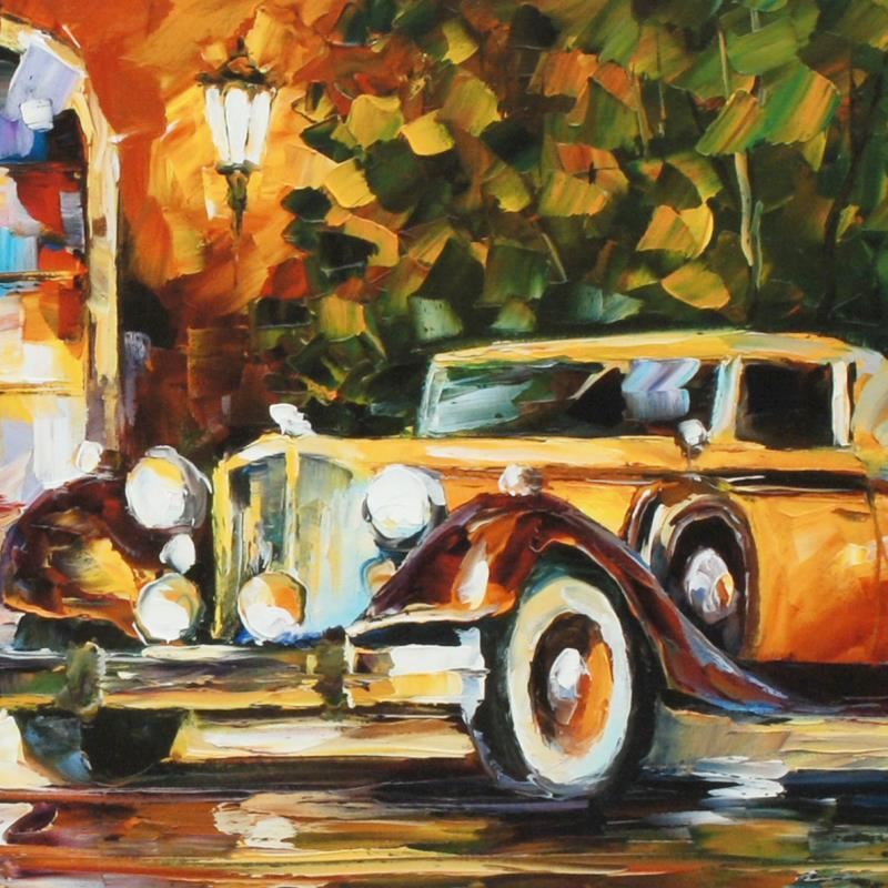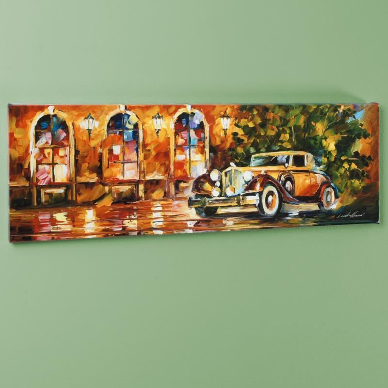Leonid Afremov's (1955-2019) masterful use of color and texture make his paintings unique collectibles that are sure to brighten any wall. "1934 Packard" is a limited edition giclee on canvas. The piece is numbered and bears the artist's authorized signature. This piece comes gallery wrapped. Includes Letter of Authenticity. Measures approx. 35" x 12" (image). This item requires special handling and may have a longer than usual turnaround.