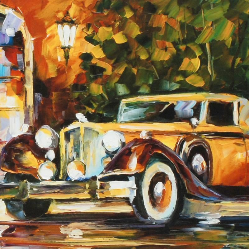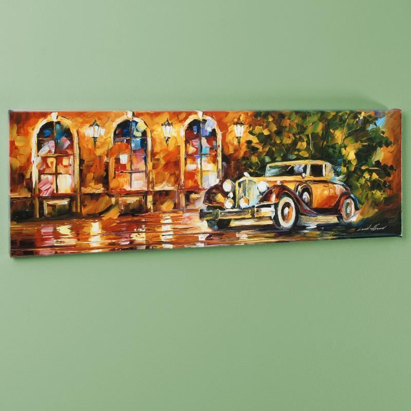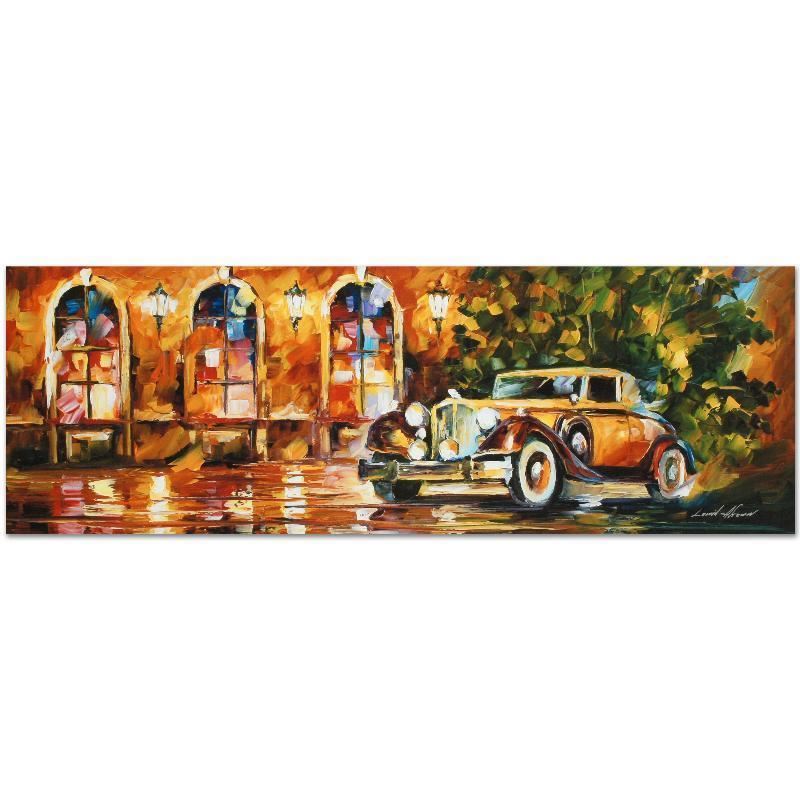 Leonid Afremov's masterful use of color and texture make his paintings unique collectibles that are sure to brighten any wall. "1934 Packard" is a limited edition giclee on canvas. The piece is numbered and bears the artist's authorized signature. This piece comes gallery wrapped. Includes Certificate of Authenticity! Measures approx. 35" x 12" (image).