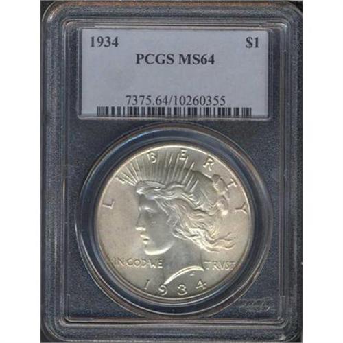 <b>1934 Peace Dollar. PCGS graded MS64.</b> The strike on this issue is nearly always very sharp, and the present choice is no exception. The obverse is especially satiny <b>(PCGS # 7375)</b>