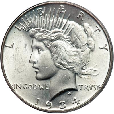 1934 Peace Dollar. PCGS graded MS-64. Satiny luster appears for the first time with the issues of 1934 and 1935 after a five-year hiatus from 1929-33 when no Peace dollars were minted. These were issued as part of Pres. Roosevelts inflationary money printing which began in January 1934 after the price of gold had been revalued to $35 an ounce from $20 an ounce (meaning a devaluation in the competing paper dollar) (PCGS # 7375).