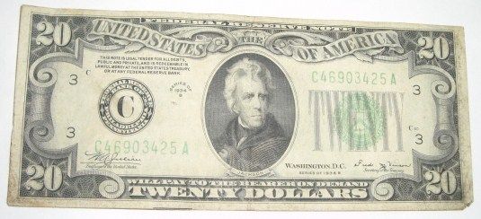 1934 RARE SERIES B TWENTY $20 U.S. FEDERAL RESERVE NOTE *RARE HIGH GRADE* SERIAL # C46903425A!! ***Coin, Currency & All Items Listed in this auction - Grades, Conditions and Values are not Safe Deposit Coins LLC Responsibilty. Grades, Condition and Values are determined by Consigner(s) & Buyers ONLY***