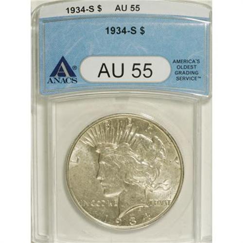 <B>1934-S $1 AU55 ANACS.</B></I> NGC Census: (173/1155). PCGS Population (215/1913). Mintage: 1,011,000. Numismedia Wsl. Price for NGC/PCGS coin in AU55: $496. (#7377)<BR><BR><b>Shipping:</b> Coins & Currency (<a target="_blank" href="http://www.heritageauctions.com/common/shipping.php">view shipping information</a>)