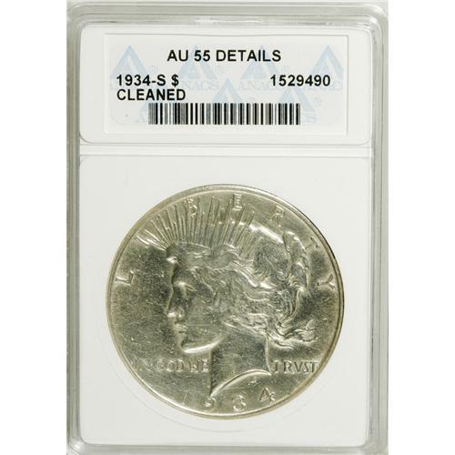 <B>1934-S $1 --Cleaned--ANACS. AU55 Details.</B></I> NGC Census: (171/1142). PCGS Population (214/1907). Mintage: 1,011,000. Numismedia Wsl. Price: $496. (#7377)<BR><BR><b>Shipping:</b> Coins & Currency (<a target="_blank" href="http://www.heritageauctions.com/common/shipping.php">view shipping information</a>)