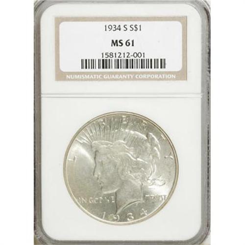 <B>1934-S $1 MS61 NGC.</B></I> The 1934-S is the series key in most Mint State grades, including MS61. This fully lustrous representative has light gold toning and good obverse eye appeal. The eagle's body reveals numerous tiny marks once viewed with a loupe.<BR><BR><B>Coin Engraver:</B> Anthony de Francisci<BR><BR><b>Shipping:</b> Coins & Currency (<a target="_blank" href="http://www.heritageauctions.com/common/shipping.php">view shipping information</a>)
