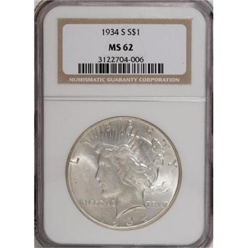<B>1934-S $1 MS62 NGC.</B></I> Light caramel-gold patina invigorates this lustrous and suitably struck Peace dollar. Thorough scrutiny with the aid of loupe fails to identify any marks or hairlines that would deny a finer grade. The mintage of just above 1 million pieces would make the 1934-S a better date in any event, but it turns out that most of the 1934-S entered circulation. Mint State examples are scarcer than for any other issue.<BR><BR><B>Coin Engraver:</B> Anthony de Francisci<BR><BR><b>Shipping:</b> Coins & Currency (<a target="_blank" href="http://www.heritageauctions.com/common/shipping.php">view shipping information</a>)