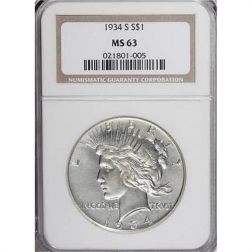 <B>1934-S $1 MS63 NGC.</B></I> <B>Prooflike. </B></I>Here is a coin that has a lot going for it on several fronts. As an issue, the 1934-S is a key to the series and is so well known as such that it hardly needs to be mentioned. What is most unusual about this particular coin, though, is not its absolute rarity, but rather its rarity as a prooflike coin. As a rule, Peace dollars were not produced with prooflike fields. Only a few issues are known with any degree of reflectivity, the best known being the 1926-S, which is occasionally found with heavily striated semi-prooflike and prooflike fields. The 1934-S is not one of the obvious choices for a "prooflike" Peace dollar. (We should insert at this point that we are the ones calling this coin Prooflike--it is not labeled as such on the NGC insert). The 1934-S is generally located with bright, lustrous, satiny surfaces. The fields on this piece go a step beyond the usual bright and satiny appearance, and show what would be considered in the Morgan series semi-prooflikeness, which were created by light die polishing. It is sheer speculation why this coin has extra brightness in the fields, or more to the point why the fields were polished. Perhaps it was to eliminate die clashing or some other mint-made imperfection. Whatever the reason, the result was a more attractive coin. The coin also displays full striking details on each side and brilliant surfaces. Both obverse and reverse are minimally abraded for an MS63 coin, and the overall eye appeal is far greater than the stated grade.<BR><BR><B>Coin Engraver:</B> Anthony de Francisci<BR><BR><b>Shipping:</b> Coins & Currency (<a target="_blank" href="http://www.heritageauctions.com/common/shipping.php">view shipping information</a>\)