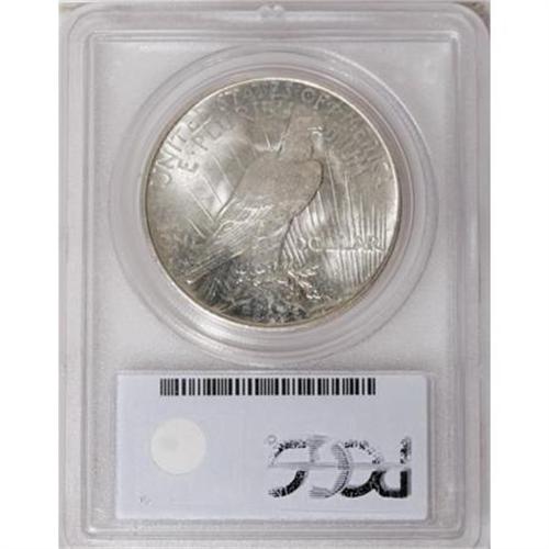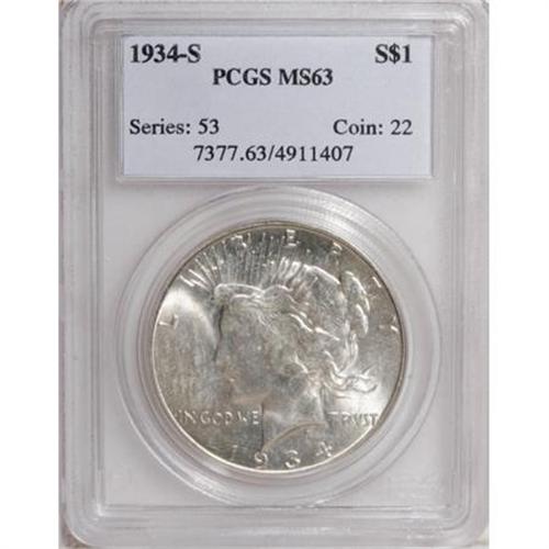 <B>1934-S $1 MS63 PCGS.</B></I> Close examination will reveal the slightest traces of gold toning on the obverse, with a fully brilliant and untoned reverse. This is an attractive example that is really quite acceptable for the grade. MS63 is a popular grade level for collectors of Mint State Peace dollars.<BR><BR><b>Shipping:</b> Coins & Currency (<a target="_blank" href="http://www.heritageauctions.com/common/shipping.php">view shipping information</a>)