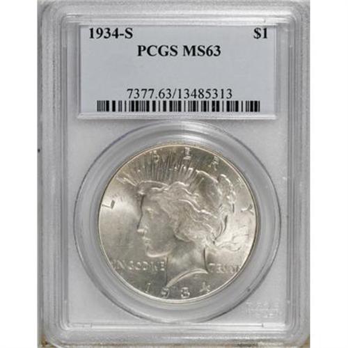 <B>1934-S $1 MS63 PCGS.</B></I> VAM-3. A Top 50 Variety. The VAM is unrecorded on the PCGS insert, but die doubling is noticeable on the rays in Liberty's tiara. This lustrous key date representative is pleasantly free from relevant marks, and is originally toned in delicate ice-blue and almond-gold.<BR><BR><B>Coin Engraver:</B> Anthony de Francisci<BR><BR><b>Shipping:</b> Coins & Currency (<a target="_blank" href="http://www.heritageauctions.com/common/shipping.php">view shipping information</a>)