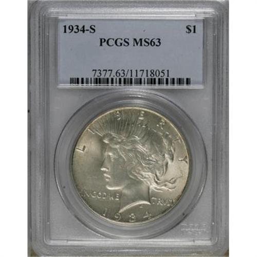 <B>1934-S $1 MS63 PCGS.</B></I> Brilliant surfaces are slightly subdued by light champagne and faint iridescent toning on both sides. The sharp design features on both sides add to the desirability of this key-date Peace dollar. A single line on Liberty's cheek and a few blemishes in the field are the only distracting marks on an otherwise well-preserved dollar.<BR><BR><B>Coin Engraver:</B> Anthony de Francisci<BR><BR><b>Shipping:</b> Coins & Currency (<a target="_blank" href="http://www.heritageauctions.com/common/shipping.php">view shipping information</a>)