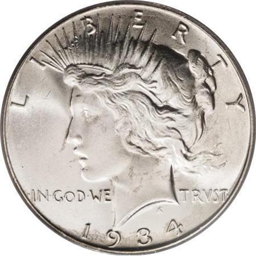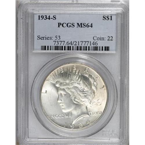 <B>1934-S $1 MS64 PCGS.</B></I> Light caramel-gold patina visits the right obverse of this carefully preserved and lustrous key date dollar, but the surfaces are primarily untoned. Although several other issues have lower mintages, including the first-year 1921, the 1934-S is the scarcest in Mint State.<BR><BR><B>Coin Engraver:</B> Anthony de Francisci<BR><BR><b>Shipping:</b> Coins & Currency (<a target="_blank" href="http://www.heritageauctions.com/common/shipping.php">view shipping information</a>)
