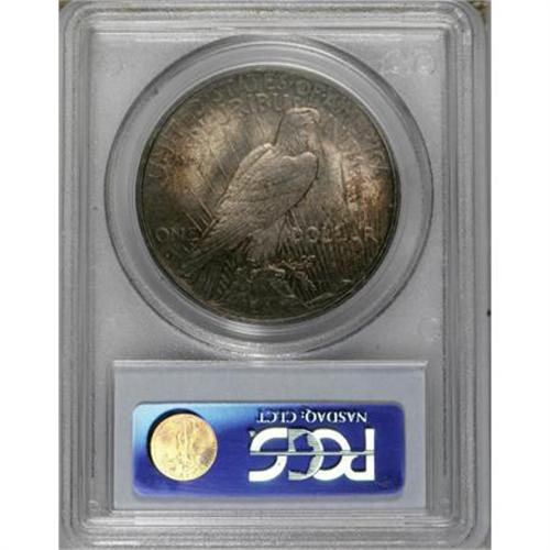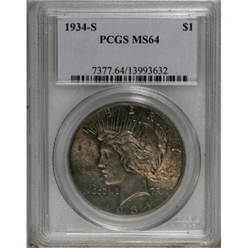 <B>1934-S $1 MS64 PCGS.</B></I> The key date of the Peace dollar series in Mint State. This lustrous near-Gem displays medium intensity golden-gray toning imbued with sky-blue, orange, and violet accents, and yields an above-average strike for the issue. A handful of minute marks is all that keeps this lovely specimen from full Gem status.<BR><BR><B>Coin Engraver:</B> Anthony de Francisci<BR><BR><b>Shipping:</b> Coins & Currency (<a target="_blank" href="http://www.heritageauctions.com/common/shipping.php">view shipping information</a>)