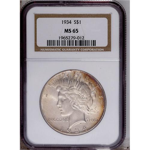 <B>1934<img border='0' src='http://www.heritagecoins.com/images/star.gif' width=10 height=10>$1> MS65 NGC.</B></I> A clean-cheeked and flashy Gem that features an exquisite strike and an abundant amount of warm apricot-golden patina on the obverse. A popular issue, since the mintage is lower than that of the key date 1934-S.