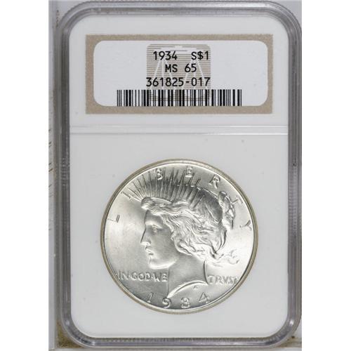 1934 S$1 MS65 NGC. Brilliant and boldly struck with gr