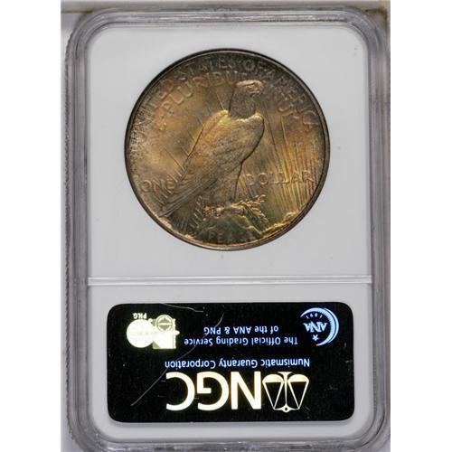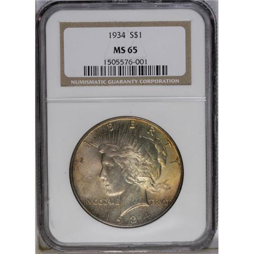 <B>1934<img border='0' src='http://www.heritagecoins.com/images/star.gif' width=10 height=10>$1> MS65 NGC.</B></I> Fully patinated in rose-gold, apple-green, lilac, and cream-gray shades. The cartwheel luster is nonetheless impressive, and the sharply struck surfaces are void of relevant marks. A desirable example of this late P-mint issue.