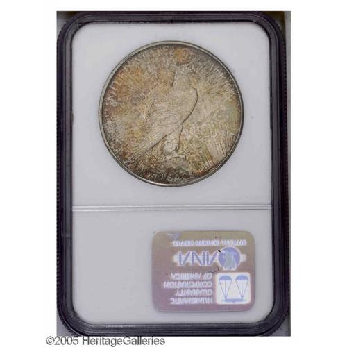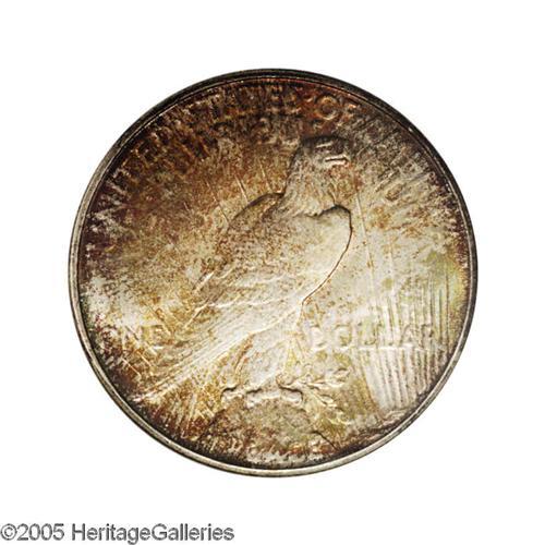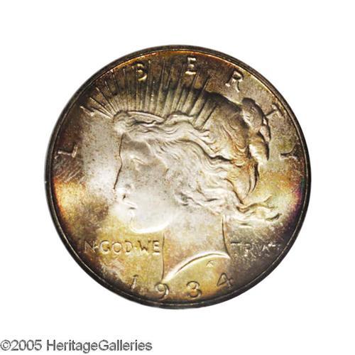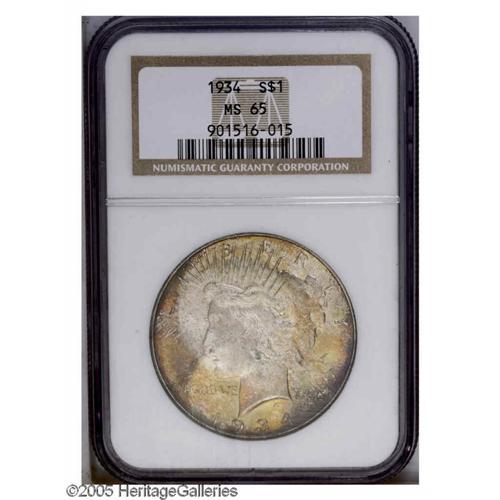 <B>1934<S$1> MS65 NGC.</B></I> Richly variegated patina is splashed across the surfaces of this well preserved Gem. Amber, gold, mint-green, crimson, and golden-brown colors are the most prominent. Highly lustrous and free of distracting marks, a really lovely Peace dollar.