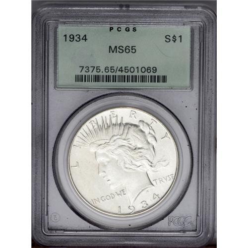 <B>1934<img border='0' src='http://www.heritagecoins.com/images/star.gif' width=10 height=10>$1> MS65 PCGS.</B></I> A highly lustrous and essentially fully struck Gem with a mere whisper of tan and powder-blue on each side. Smooth surfaces ensure the quality. Encased in a green label holder. <BR><BR><B>Important notice:</B> Heritage usually auctions material at the rate of 200-250 lots per hour. On some occasions eBay Live bid software or the Internet may not be able to keep up with the pace of the auction. We recommend placing a realistic absentee bid now as insurance to avoid disappointment. Occasionally the auctioneer may eliminate or reject an eBay Live bid, and the auctioneer may also reopen a lot after the close of the eBay live bidding (usually because we missed an audience bid), and may reject your bid even if it shows you as the winning bidder. By bidding via eBay Live, you agree that Heritage may award the lot to another bidder at its sole discretion under the circumstances described above or any other reasonable circumstances. Since eBay bids are not shown to us until we open the lot on the floor, we treat those bids just like floor bids. In most cases the floor responds before the eBay bid is presented to us, due to Internet lag time, so for consistency we have made it a policy that floor bids are always considered first over tie eBay live bids. Also please note that all Heritage lots purchased through eBay Live carry a 20% Buyer's Premium. Please make sure you read the Terms and Conditions before you bid. This lot is being auctioned in conjunction with a live floor auction by Heritage Galleries & Auctioneers. All final auction and invoice information will be supplied by Heritage Galleries & Auctioneers, and all other information should be considered preliminary. Lot:3869 <BR><BR><B>Winning Notification and Billing:</B> After the FINAL session in this auction is complete, Heritage will send e-mail and snail mail invoices. This process normally takes several days. All final auction and invoice information will be supplied by Heritage Galleries & Auctioneers, and all other information should be considered preliminary. <BR><BR>This auction will be conducted on a live auction floor and over the Internet through eBay Live. If you choose to place an absentee bid, please take a moment to <font color='#0000ff'><u><a href='http://pages.ebay.com/liveauctions/help/before/laabsentee.html'>learn how eBay Live absentee bidding works</a></u></font><font color='#000000'>