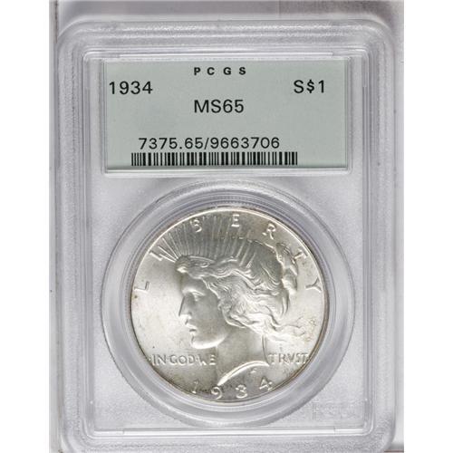 <B>1934<img border='0' src='http://www.heritagecoins.com/images/star.gif' width=10 height=10>$1> MS65 PCGS.</B></I> Thinly veiled in patina with small areas of greater intensity on both sides. A nice Gem representative with no abrasions of significance on either side. Housed in a green PCGS holder of times past.