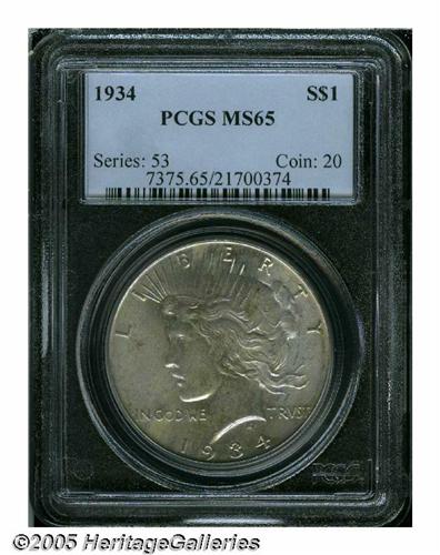 <B>1934<S$1> MS65 PCGS.</B></I> Well struck with an attractive coating of subtly variegated pastel toning over both sides, pleasing satin luster, and a few noticeable contact marks.