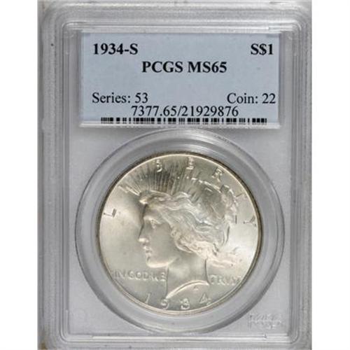 <B>1934-S $1 MS65 PCGS.</B></I> Long sought after as a key-date among Peace dollars, the '34-S is elusive in Gem grades. Both sides of this specimen have frosty silver surfaces with ivory luster and a trace of iridescent toning. PCGS has only graded 22 finer examples, mostly a single point better than this piece.<BR><BR><B>Coin Engraver:</B> Anthony de Francisci<BR><BR><b>Shipping:</b> Coins & Currency (<a target="_blank" href="http://www.heritageauctions.com/common/shipping.php">view shipping information</a>)
