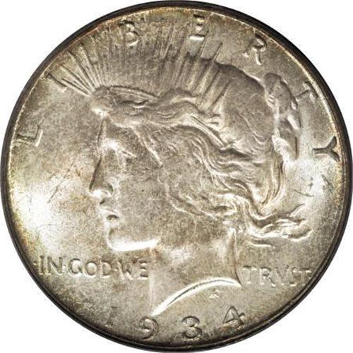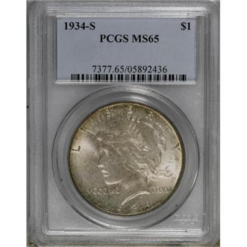 <B>1934-S $1 MS65 PCGS.</B></I> Soft violet, powder-blue, beige, and orange-gold patina visits the obverse of this Gem key date, while light silver-gray shows on the reverse. An attentive strike results in above average definition on the design features. A faint graze in the left obverse field is mentioned for complete accuracy.<BR><BR><B>Coin Engraver:</B> Anthony de Francisci<BR><BR><b>Shipping:</b> Coins & Currency (<a target="_blank" href="http://www.heritageauctions.com/common/shipping.php">view shipping information</a>)