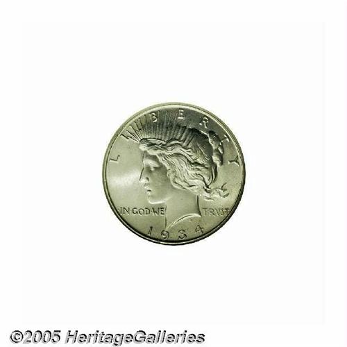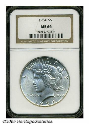 <B>1934<S$1> MS66 NGC.</B></I> Sharply struck and fully brilliant with excellent eye appeal. The obverse tends toward frosty luster while the reverse has a satiny appearance. An impressive Premium Gem example. Population: 19 in 66, 3 finer (5/05).