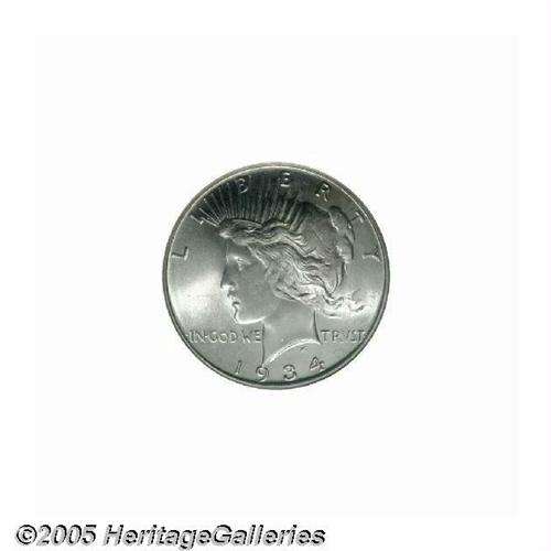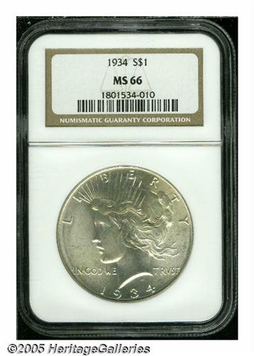 <B>1934<S$1> MS66 NGC.</B></I> The 1934 is a very scarce item in Gem condition and in MS66 condition is undeniably rare with only 20 pieces having been so graded by NGC and a mere three finer (5/05).Sharply struck throughout, the essentially untoned surfaces are exceptionally bright with thick, satiny mint luster.