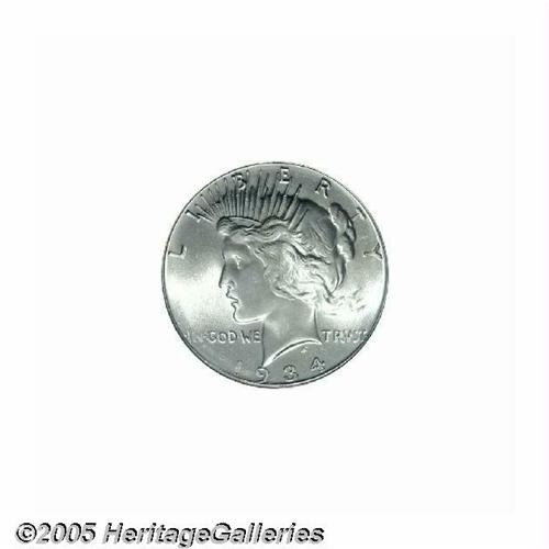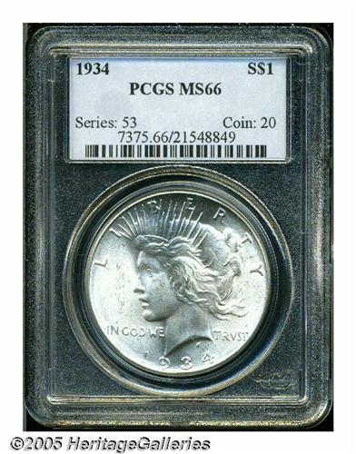 <B>1934<S$1> MS66 PCGS.</B></I> Brilliant and sharply struck with exceptional eye appeal. The surfaces are free of toning and have soft, frosty silver luster. A lovely example, a coin for the ages. Population: 103 in 66, 3 finer (5/05).