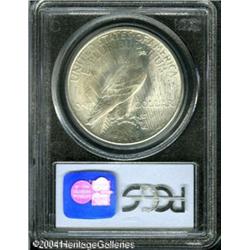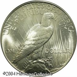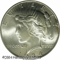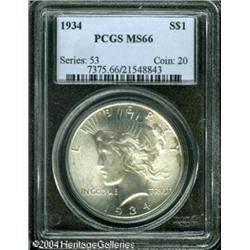 1934 S$1 MS66 PCGS. Coinage of silver dollars was <B>1934 S$1 MS66 PCGS.</B></I> Coinage of silver dollars was halted in 1928 after the bullion purchased from Western silver mine owners was exhausted. The silver dollars of 1934-1935 were coined from silver acquired under various authorizations, including the Act of May 12, 1933 empowering the government to accept silver on war debt accounts for conversion into silver dollars, President Roosevelt's proclamation of December 21, 1933 mandating that the mints coin silver dollars from newly-purchased Western mine bullion, and the Silver Purchase Act of June 18, 1934 ordering the Treasury to buy silver worldwide until its market price reached $1.2929 per ounce (a figure considered to be the standard value of silver for many years), or until the monetary value of the Treasury's silver holdings reached 1/3 of the value of its gold stock. The premium Gem offered here has bright, lustrous surfaces that are untoned, save for a couple of areas of olive toning along the right obverse border. The design elements are sharply struck, and a few tiny, unobtrusive marks on the eagle are not bothersome. An exceptionally flashy example. Population: 87 in 66, 3 finer (10/04). <BR><BR><B>Important notice:</B> Heritage usually auctions material at the rate of 200-250 lots per hour. On some occasions eBay Live bid software or the Internet may not be able to keep up with the pace of the auction. We recommend placing a realistic absentee bid now as insurance to avoid disappointment. Occasionally the auctioneer may eliminate or reject an eBay Live bid, and the auctioneer may also reopen a lot after the close of the eBay live bidding (usually because we missed an audience bid), and may reject your bid even if it shows you as the winning bidder. By bidding via eBay Live, you agree that Heritage may award the lot to another bidder at its sole discretion under the circumstances described above or any other reasonable circumstances. Since eBay bids are not shown to us until we open the lot on the floor, we treat those bids just like floor bids. In most cases the floor responds before the eBay bid is presented to us, due to Internet lag time, so for consistency we have made it a policy that floor bids are always considered first over tie eBay live bids. Also please note that all Heritage lots purchased through eBay Live carry a 20% Buyer's Premium. Please make sure you read the Terms and Conditions before you bid. This lot is being auctioned in conjunction with a live floor auction by Heritage Galleries & Auctioneers. All final auction and invoice information will be supplied by Heritage Galleries & Auctioneers, and all other information should be considered preliminary. Lot:7820