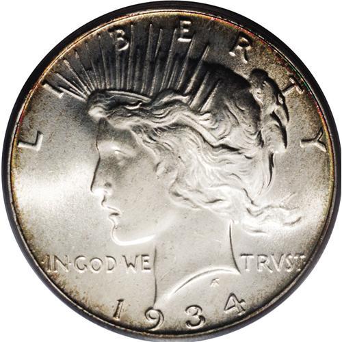 <B>1934<img border='0' src='http://www.heritagecoins.com/images/star.gif' width=10 height=10>$1> MS66 PCGS.</B></I> Excellent luster characteristics typify this pleasing satin-surfaced Gem. Lightly toned with peripheral golden-brown coloration and showing only the most trivial abrasions on the delicate fields and devices. One of the finest survivors of this scarce, low mintage year. Population: 112 in 66, only 3 are finer (4/06).