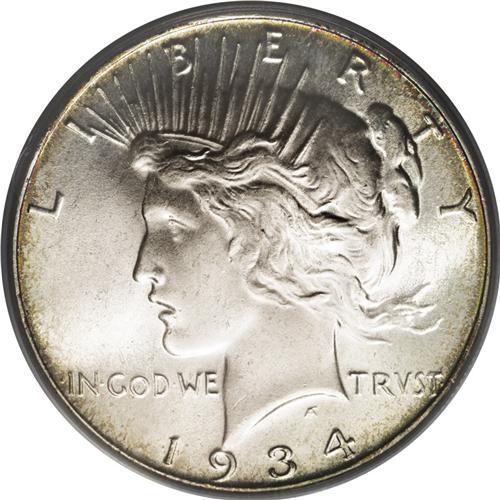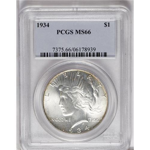 <B>1934<img border='0' src='http://www.heritagecoins.com/images/star.gif' width=10 height=10>$1> MS66 PCGS.</B></I> Excellent luster characteristics typify this pleasing satin-surfaced Gem. Lightly toned with peripheral golden-brown coloration, showing only the most trivial abrasions on the delicate fields and devices. One of the finest survivors of this scarce, low mintage year. PCGS has only certified three finer examples of this date (8/06).