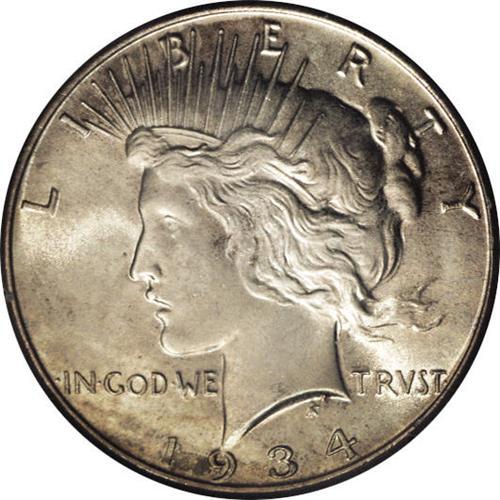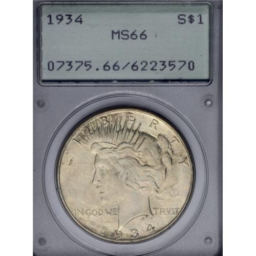 <B>1934<img border='0' src='http://www.heritagecoins.com/images/star.gif' width=10 height=10>$1> MS66 PCGS.</B></I> A first-generation PCGS Premium Gem with light gold toning across both sides. The underlying surfaces have soft, frosty luster, and they are essentially pristine. Although the population in this grade is modest, it is extremely rare in finer grades. Of course, any Superb Gem Peace dollar is rare, regardless of the date. Population: 110 in 66, 3 finer (3/06).<BR><I>From The David L. Goodwin Collection.</B></I> <BR><BR><B>Important notice:</B> Heritage usually auctions material at the rate of 200-250 lots per hour. On some occasions eBay Live bid software or the Internet may not be able to keep up with the pace of the auction. We recommend placing a realistic absentee bid now as insurance to avoid disappointment. Occasionally the auctioneer may eliminate or reject an eBay Live bid, and the auctioneer may also reopen a lot after the close of the eBay live bidding (usually because we missed an audience bid), and may reject your bid even if it shows you as the winning bidder. By bidding via eBay Live, you agree that Heritage may award the lot to another bidder at its sole discretion under the circumstances described above or any other reasonable circumstances. Since eBay bids are not shown to us until we open the lot on the floor, we treat those bids just like floor bids. In most cases the floor responds before the eBay bid is presented to us, due to Internet lag time, so for consistency we have made it a policy that floor bids are always considered first over tie eBay live bids. Also please note that all Heritage lots purchased through eBay Live carry a 20% Buyer's Premium. Please make sure you read the Terms and Conditions before you bid. This lot is being auctioned in conjunction with a live floor auction by Heritage Galleries & Auctioneers. All final auction and invoice information will be supplied by Heritage Galleries & Auctioneers, and all other information should be considered preliminary. Lot:3871 <BR><BR><B>Winning Notification and Billing:</B> After the FINAL session in this auction is complete, Heritage will send e-mail and snail mail invoices. This process normally takes several days. All final auction and invoice information will be supplied by Heritage Galleries & Auctioneers, and all other information should be considered preliminary. <BR><BR>This auction will be conducted on a live auction floor and over the Internet through eBay Live. If you choose to place an absentee bid, please take a moment to <font color='#0000ff'><u><a href='http://pages.ebay.com/liveauctions/help/before/laabsentee.html'>learn how eBay Live absentee bidding works</a></u></font><font color='#000000'>