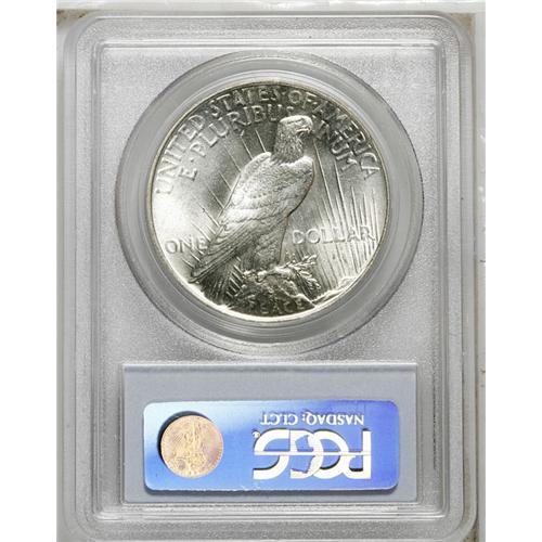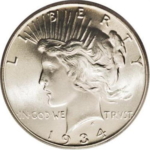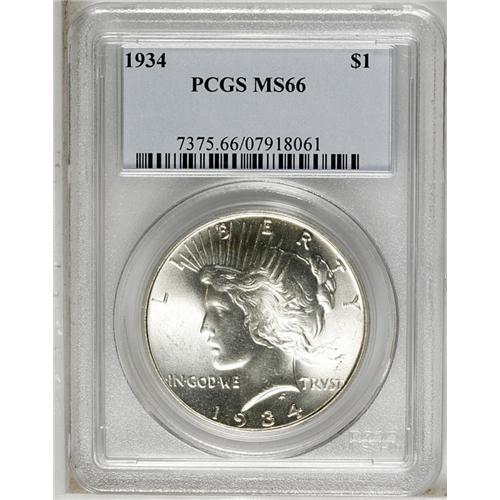 <B>1934<img border='0' src='http://www.heritagecoins.com/images/star.gif' width=10 height=10>$1> MS66 PCGS.</B></I> While plentiful in the lower conditions of Uncirculated, the 1934 is seldom located in MS66 and finer grades. Only 118 pieces have been so graded by PCGS, with three finer (8/06). This is a splendid, high grade example that is fully struck on each side--and yes, that includes both the central hair curls as well as the rightmost feathers on the eagle's wing. The mint luster on this piece is outstanding, being bright and softly frosted with no trace of toning. Additionally, there are no obvious abrasions on either side of this outstanding, high grade dollar.
