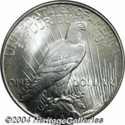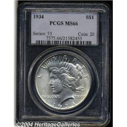 <B>1934<S$1> MS66 PCGS.</B></I> A frosty, well struck example of this scarce, low mintage year. Remarkably clean with a fully brilliant, snow-white appearance overall. A sharp, original coin that would be nearly impossible to improve upon. Population: 54 in 66, 3 finer (3/04). <BR><BR><B>Important notice:</B> Heritage usually auctions material at the rate of 200-250 lots per hour. On some occasions eBay Live bid software or the Internet may not be able to keep up with the pace of the auction. We recommend placing a realistic absentee bid now as insurance to avoid disappointment. Occasionally the auctioneer may eliminate or reject an eBay Live bid, and the auctioneer may also reopen a lot after the close of the eBay live bidding (usually because we missed an audience bid), and may reject your bid even if it shows you as the winning bidder. By bidding via eBay Live, you agree that Heritage may award the lot to another bidder at its sole discretion under the circumstances described above or any other reasonable circumstances. Since eBay bids are not shown to us until we open the lot on the floor, we treat those bids just like floor bids. In most cases the floor responds before the eBay bid is presented to us, due to Internet lag time, so for consistency we have made it a policy that floor bids are always considered first over tie eBay live bids. Also please note that all Heritage lots purchased through eBay Live carry a 20% Buyer's Premium. Please make sure you read the Terms and Conditions before you bid. </span></font></tr></table></td></tr></table>