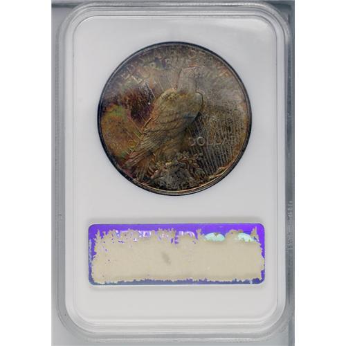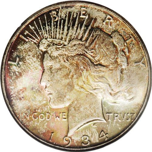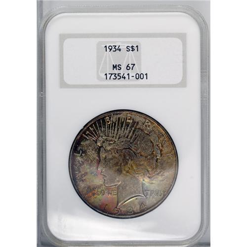 <B>1934<img border='0' src='http://www.heritagecoins.com/images/star.gif' width=10 height=10>$1> MS67 NGC.</B></I> The Silver Purchase Act of June 18, 1934 is responsible for the coining of almost 1 million Peace dollars that year. It seems that few bags of this issue were paid out, and most of the coins from bag sources seem to have been lower grade pieces that were absorbed by the market long ago. Near-Gem and Gem examples are usually obtainable for a price, but Superb examples, such as this one, are rare indeed. Only three such pieces have been certified by each of the major services with none finer (3/06). This coin has a distinctive and rather unusual appearance for a Peace dollar. It is extensively toned in every conceivable color of the rainbow. The multiple layers of toning are underlaid by bright, sparkling mint luster, and the striking details are fully brought up on each side. While 1934 dollars are often found with cleaner-than-usual surfaces, this piece is especially noteworthy in that regard.<BR><I>From The Robert Moreno Registry Collection of Peace Dollars.</B></I>