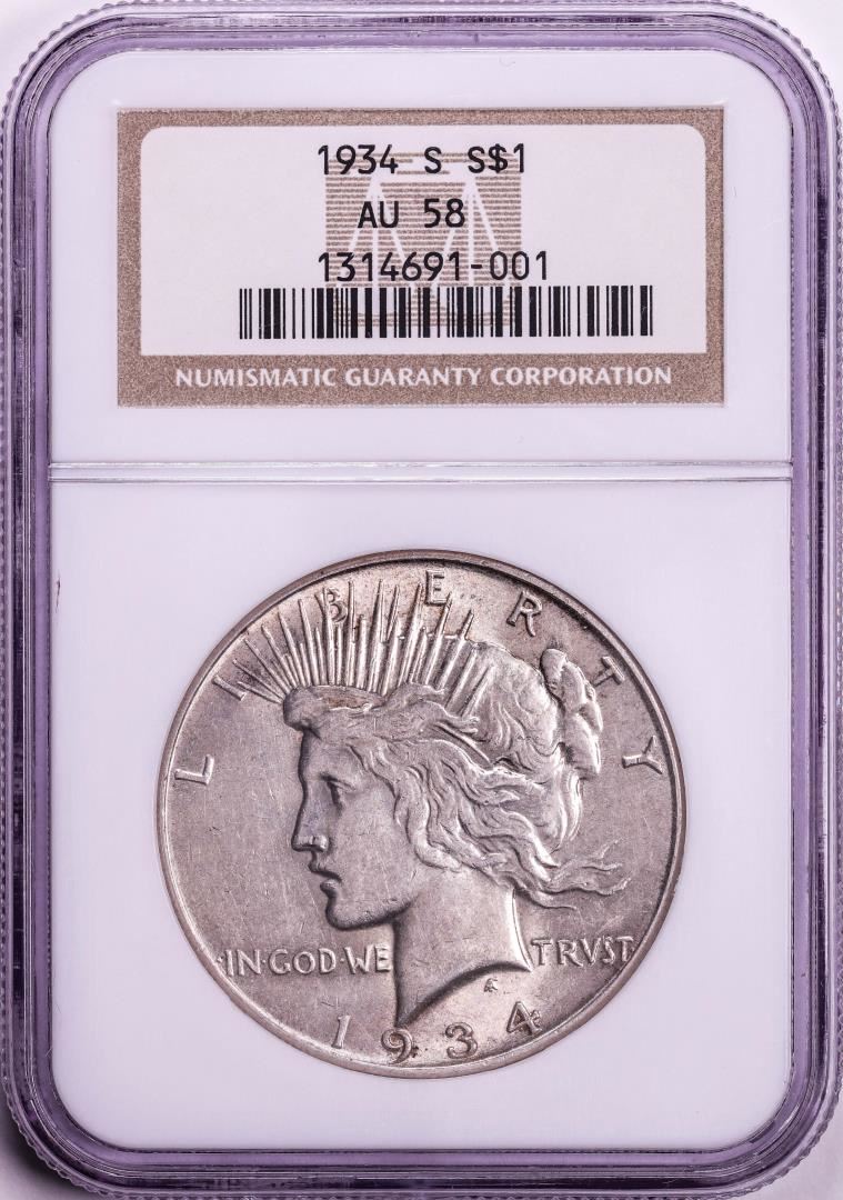 One 1934-S $1 Peace Silver Dollar Coin NGC AU58. NGC Certified.