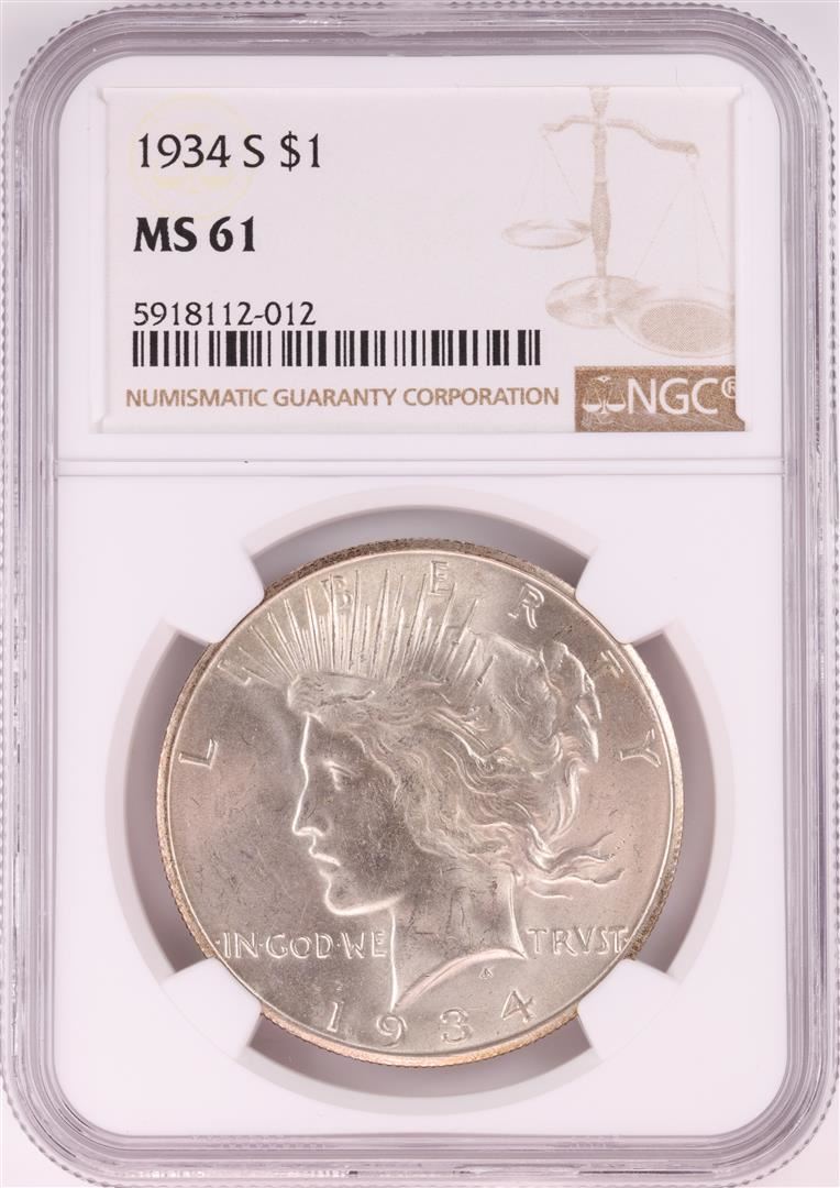 One 1934-S $1 Peace Silver Dollar Coin NGC MS61, this coin appears to be a much higher grade than assigned by NGC, hence the higher estimate, however we suggest you make your own determination. NGC Certified.